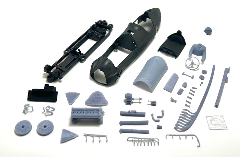 The kits includes: body and hood (bonnet for our Brit friends), chassis with embedded F1 policar style motor pod and fully adjustable, cockpit and guide all printed in PA12 on HP MJF industrial printers for unmatched mechanical properties. Very light, and impact resistant is the "to go" choice for racing. The kit is enriched by a full set of UHD resin printed accessories such as front grille, exhaust, exhaust shield and support, cockpit instruments, steering wheel, driver, period correct helmet, windhield frame, latches, engine with compressor, fuel, spark, and water lines, air intake manifold, and valve covers for building a stunning model that will stand out on every track, anda centerpiece in your collection.